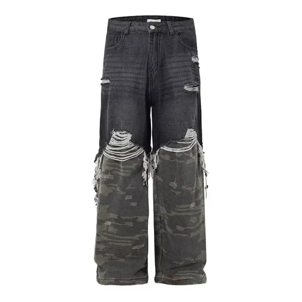 Men's Retro Camouflage Denim Straight Leg Jeans Casual Washed Loose Wide Leg with Ripped Mid Waist for Summer and Autumn